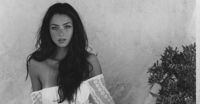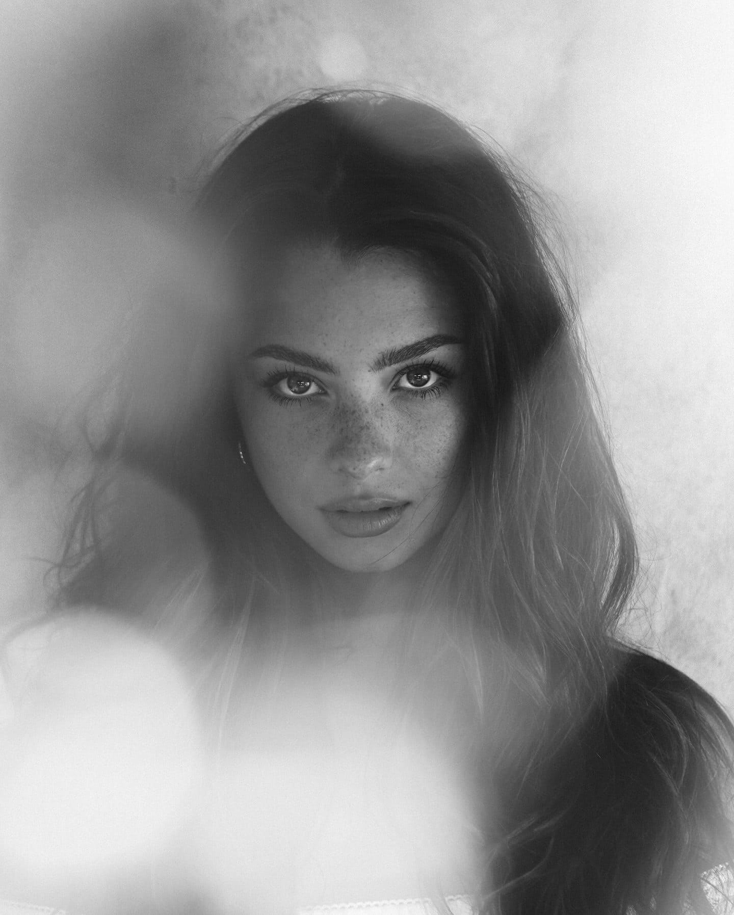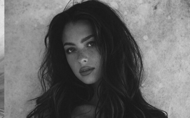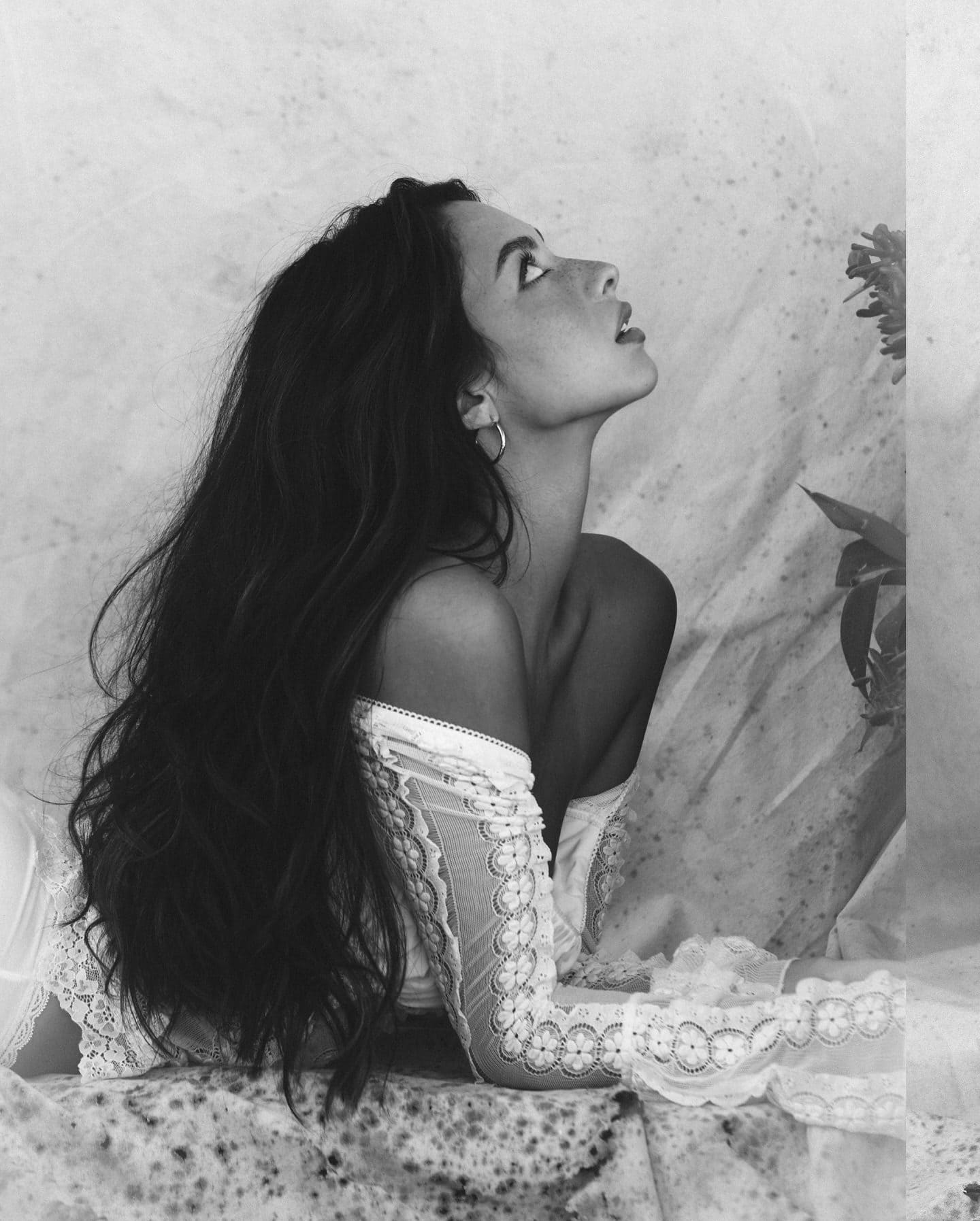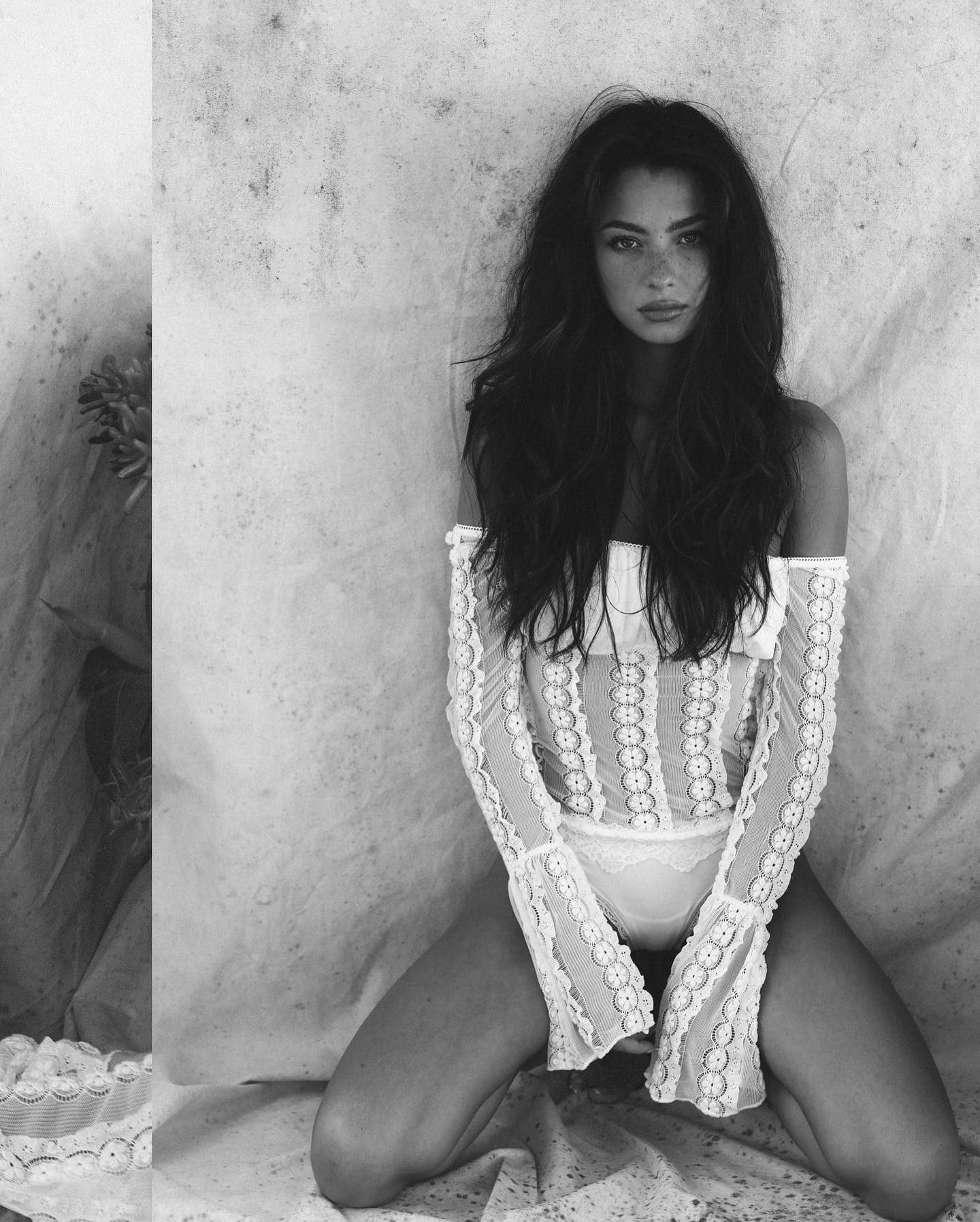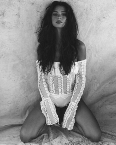 Mishka Silva showcases her figure in a translucent white lace off-shoulder bodysuit during a monochrome photoshoot. She highlights her elongated legs, shapely hips, and alluring expressions set against a vintage-inspired background. Images provided by Collin Stark.