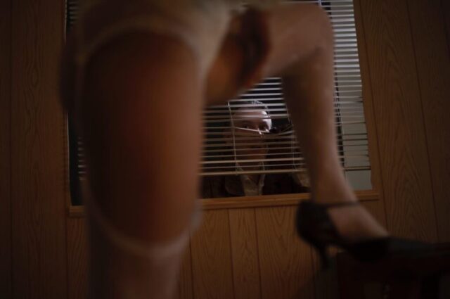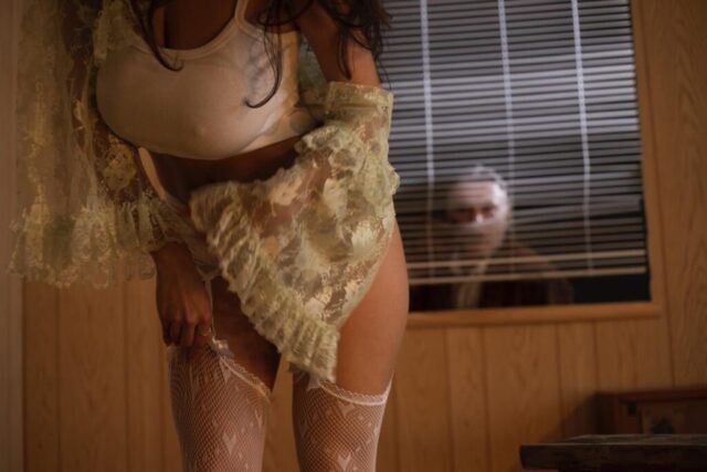 Mati Marroni is back with a steamy shoot alongside photographer John Hein. In a retro wood-paneled room, she teases in a tiny crop top and lace panties, flaunting her curves. A mysterious guy lurks outside, turning this into a wild voyeuristic fantasy.