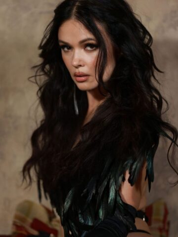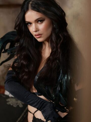 Natasha Blasick is absolutely sizzling in her new photoshoot! She’s rocking a black lace set that hugs her curves perfectly, showing off some serious cleavage. With feathers, long gloves, and thigh-high boots, she’s serving major looks and serious attitude. Total jaw-drop moment.