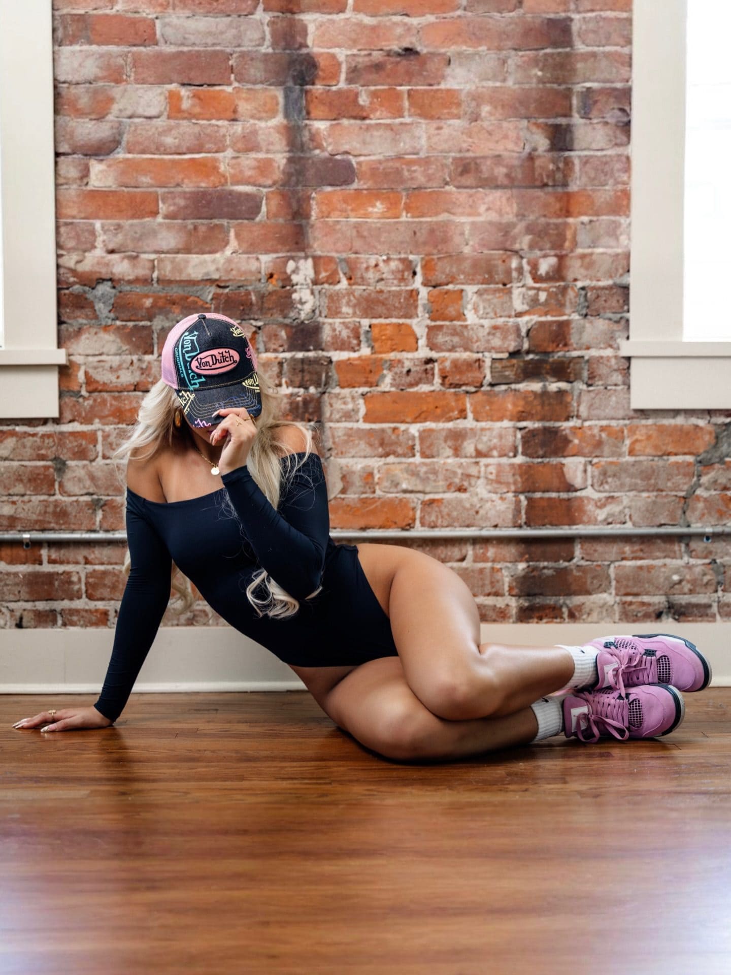 Brooklyn is absolutely killing it in her new studio shoot. She’s lounging on a wooden floor in front of a brick wall, rocking a black off-the-shoulder bodysuit and some seriously cool pink sneakers.